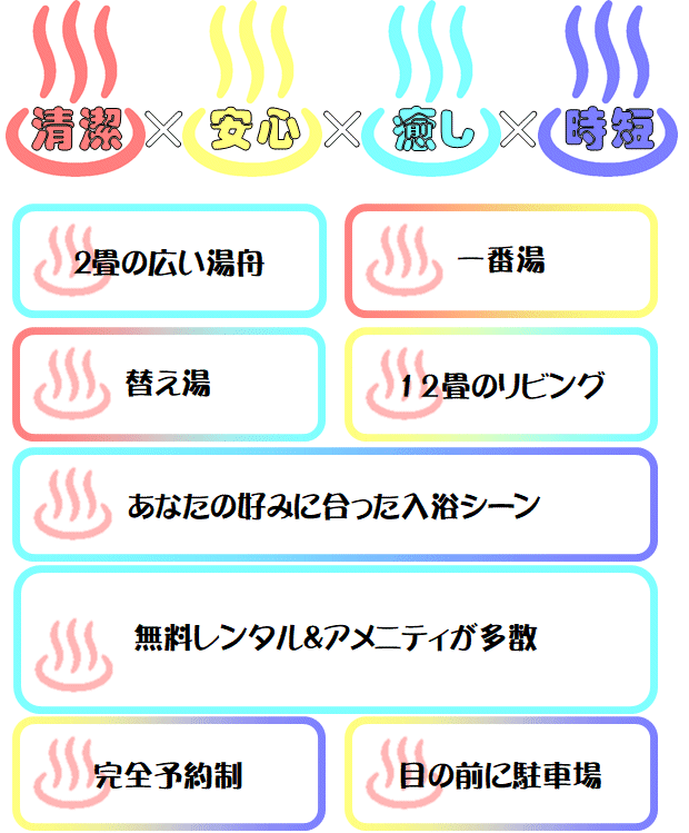 <工事中>ほてい湯には、2つの家族湯(プレミアム棟)と、9つの貸切湯(セルフ棟)があります プレミアム棟(2棟) セルフ棟(9棟) プレミアム棟A 「 七福神 」源泉掛け流し、 プレミアム棟B 「 布袋尊 」